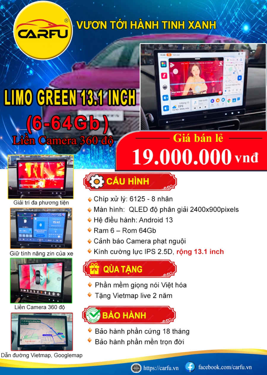 Màn hình Android LIMO GREEN (6-64GB) - 13.1 INCH là lựa chọn lý tưởng cho khách hàng muốn nâng cấp xe với màn hình lớn, cấu hình mạnh và hệ thống camera an toàn.